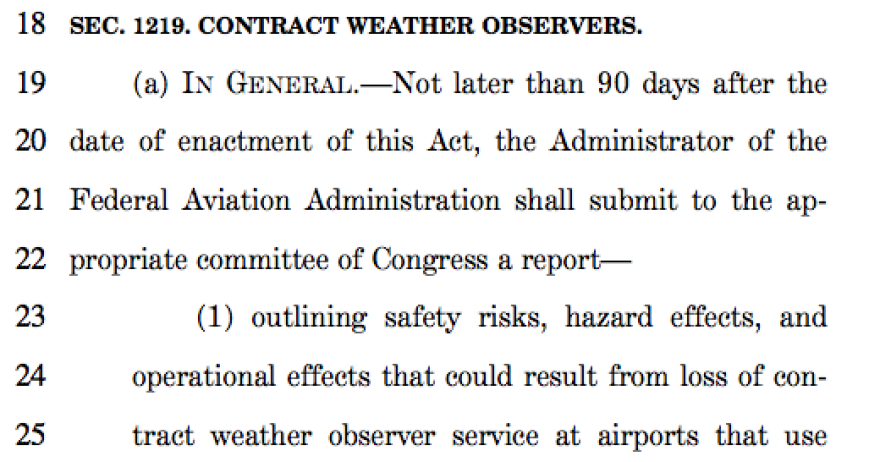 A U.S. Senate committee passed its own long-term bill last week. It included a mandate that requires the FAA to complete a sufficient safety review and issue a report to Congress before making any changes to the Contract Weather Observer program at airports across the country including Wichita’s Eisenhower National airport.