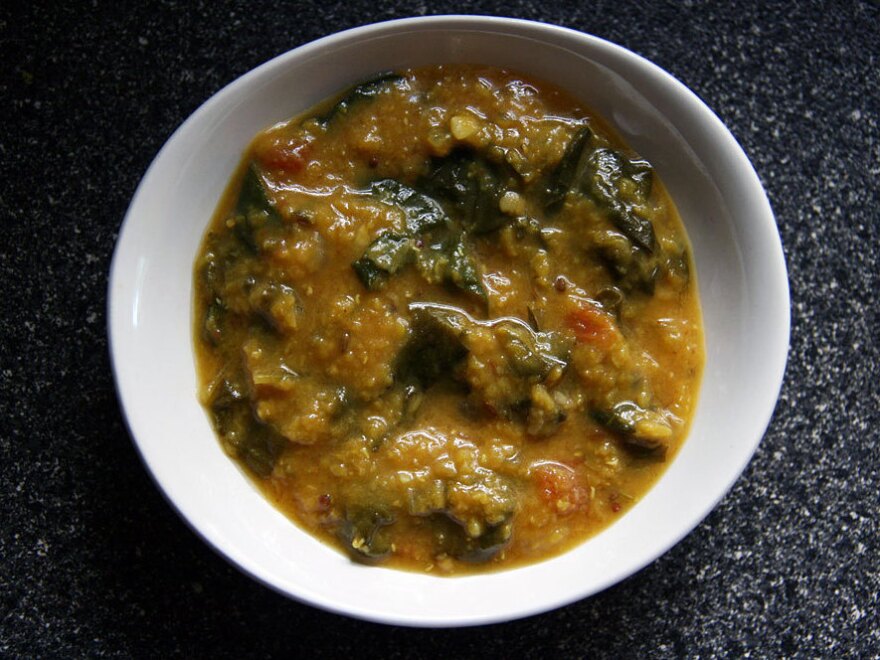 This spinach-filled lentil dish is low fat, high protein and just plain delicious. I like to deliver frozen quarts of dal with frozen packages of flatbread (Indian naan is best, but pita works in a pinch), for a complete ready-to-go dish.