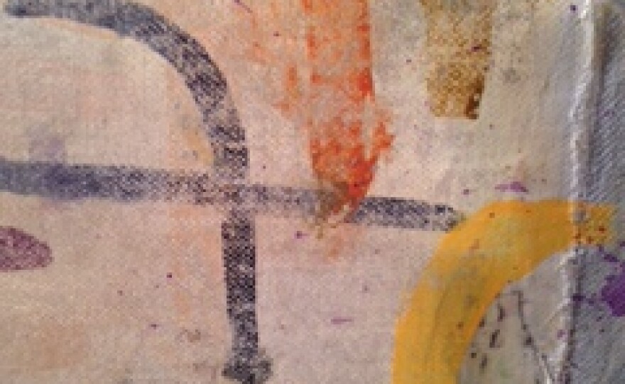 After studying my photos for color ideas I mix paint and attack the canvas with flat tip brushes and broad strokes. Sometimes I use the brush handles to cut lines into the wet paint. Strokes and cuts form texture. Graphite bleeds through. Paint spatters and drips and some of these lovely mistakes are saved.