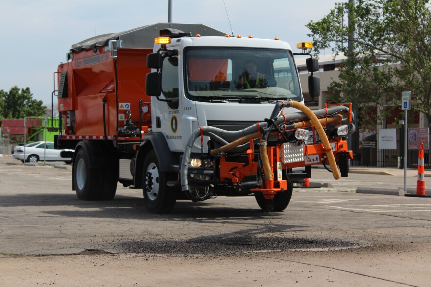Aaron Henning with the public works department says the machine—which mixes the asphalt on-site—creates a patch that can last about 5 times longer than with other techniques, like cold-patching.