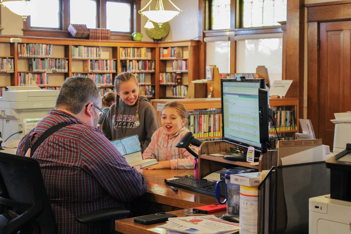 Peabody librarian Rodger Charles helps check out books for Alexa Oller and her younger sister Lucy Oller. (Meg Britton-Mehlisch / KMUW)