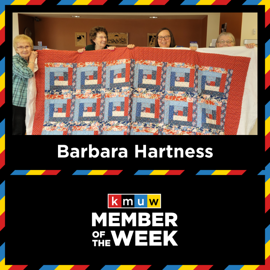 KMUW Member of the Week Barbara Hartness KMUW Published November 15, 2024 at 11:36 AM CST Facebook Twitter LinkedIn Email Barbara Hartness has been a long-time KMUW listener and has supported the station for over five years. Her favorite shows include Hidden Brain and Science Friday. Barbara loves hand quilting and volunteering.
