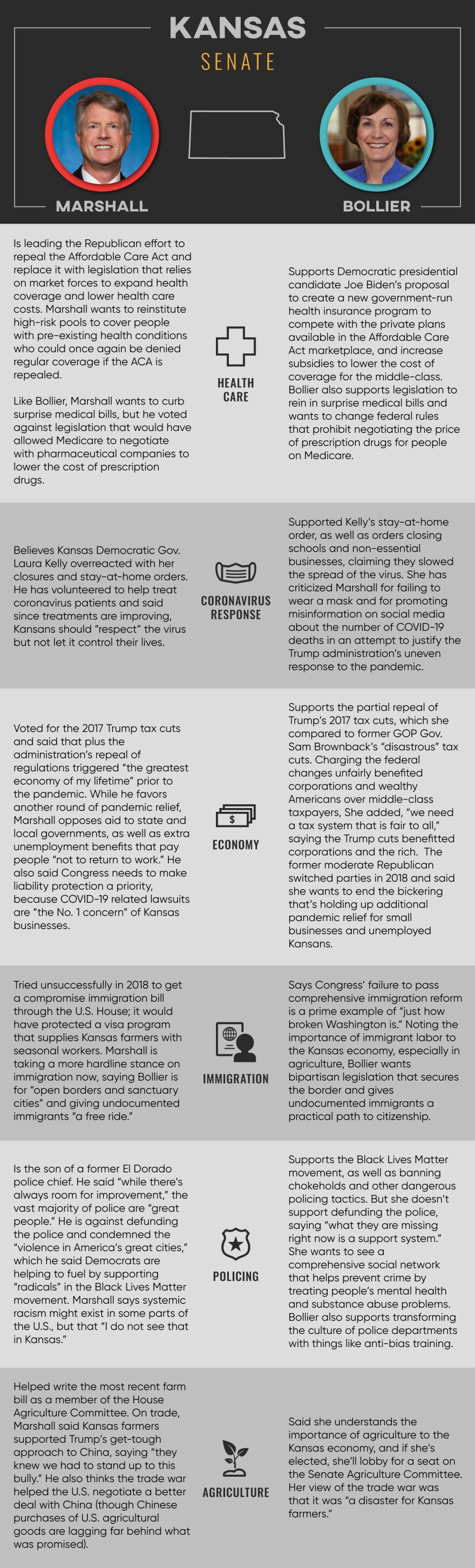 Western Kansas Congressman Roger Marshall is supporting President Donald Trump’s agenda pretty much down the line. Democratic state Sen. Barbara Bollier is attempting to ride anti-Trump sentiment in the state’s population centers to an upset victory.